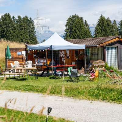Il punto d'incontro (Kafi Stübali) presso il +parcheggio per roulotte+ è aperto anche a chi vuole fortificarsi dopo un'escursione o semplicemente godersi il panorama.