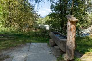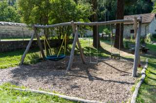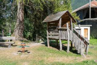 Il parco giochi si trova direttamente accanto allo storico ponte di legno. Quando si attraversa il ponte dal paese, si trova immediatamente sul lato destro.